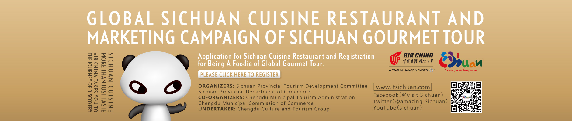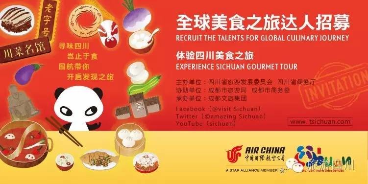 四川省観光開発委員会と四川省商務部が共催する「四川料理-More Than Just Taste」は「Talents for Global Culinary Journey Recruitment(世界のグルメ旅行タレント募集)」イニシアチブの一環として、ソーシャルメディア上の2万人以上のファンとともに、精神や食道楽の夢を実現し、それについて書いてもらう世界中の食道楽と旅行愛好者を求めている。