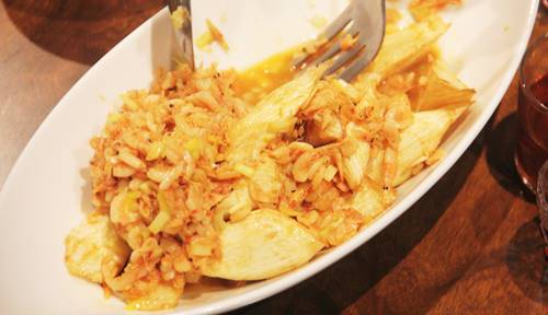 麺をたべようととったら、麺の食感じゃない、良く見ると麺に見立てたキノコ。そして、鶏肉も同じように紛れこませる技。