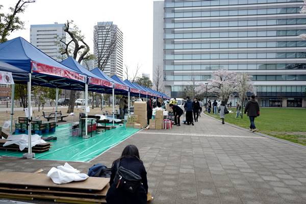 4月1日、気温10度を下回る中、 ボランティアのみんなと会場の下見と テント設営の練習を行い 、暗くなるまで設営準備を行っていました。