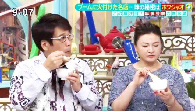 MC関ジャニの丸山さん、小堺さん、ピコ太郎さんこと古坂大魔王、島崎和歌子さん、前園さん…皆さん陳麻婆豆腐をおいしそうに試食。