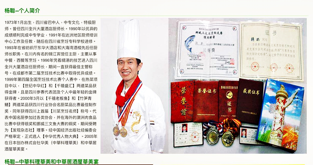 1999年に当時四川人最年少記録を打ち立て「中国料理コンクール」で優勝。中国で最高峰の料理人に与えられる称号「特級厨師」、四川省認定「川菜烹飪名師」といった輝かしいタイトルを持つ楊聡シェフがオーナーの店舗です。