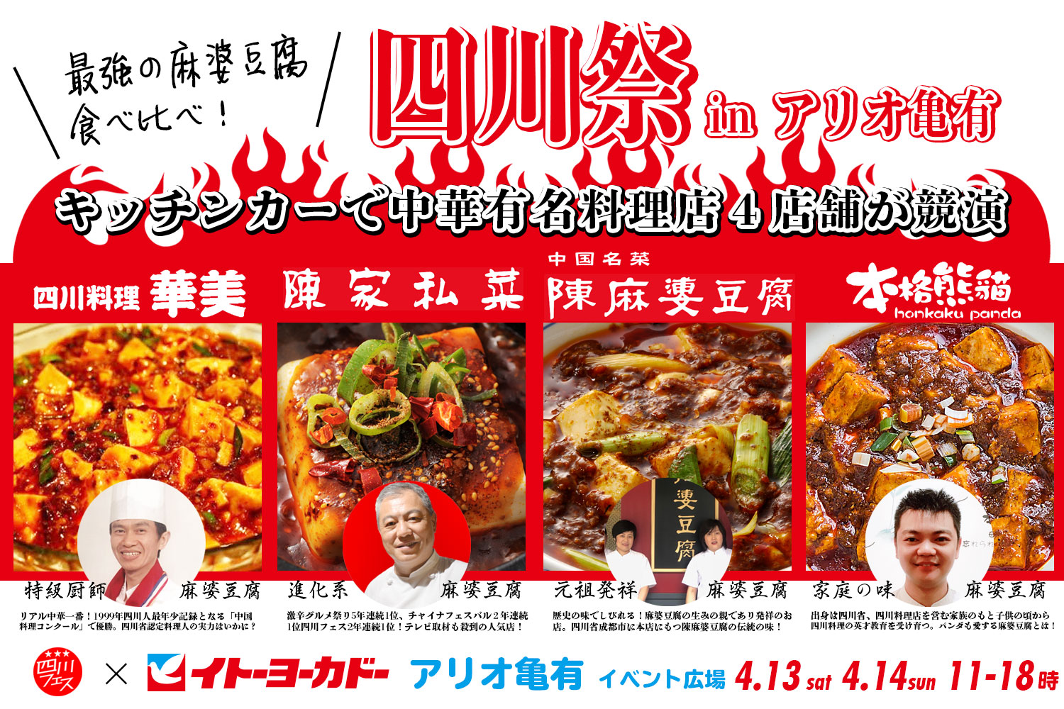 4つの麻婆豆腐の味が楽しめて、さらにそれぞれのお店の四川の伝統料理特性料理が食べれるとなると、はじめて本場の四川料理を食べる人にも、きっと喜んでもらえるのでは?ということで、以下のお店が出店します。
