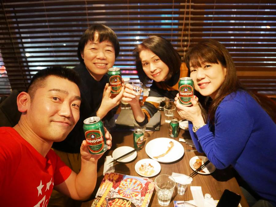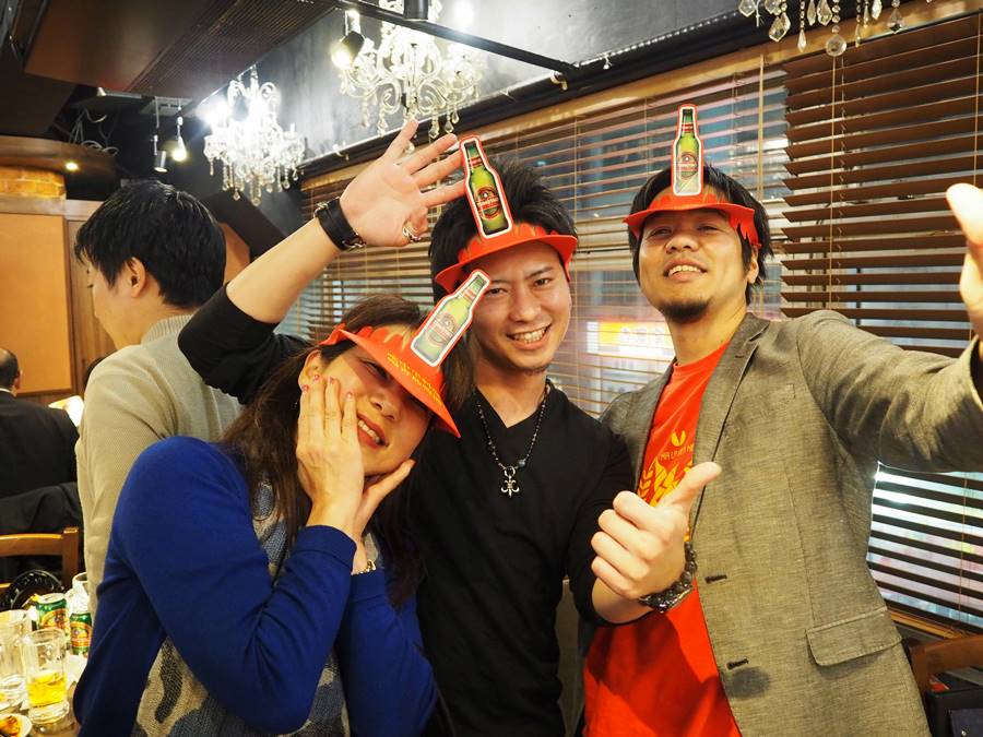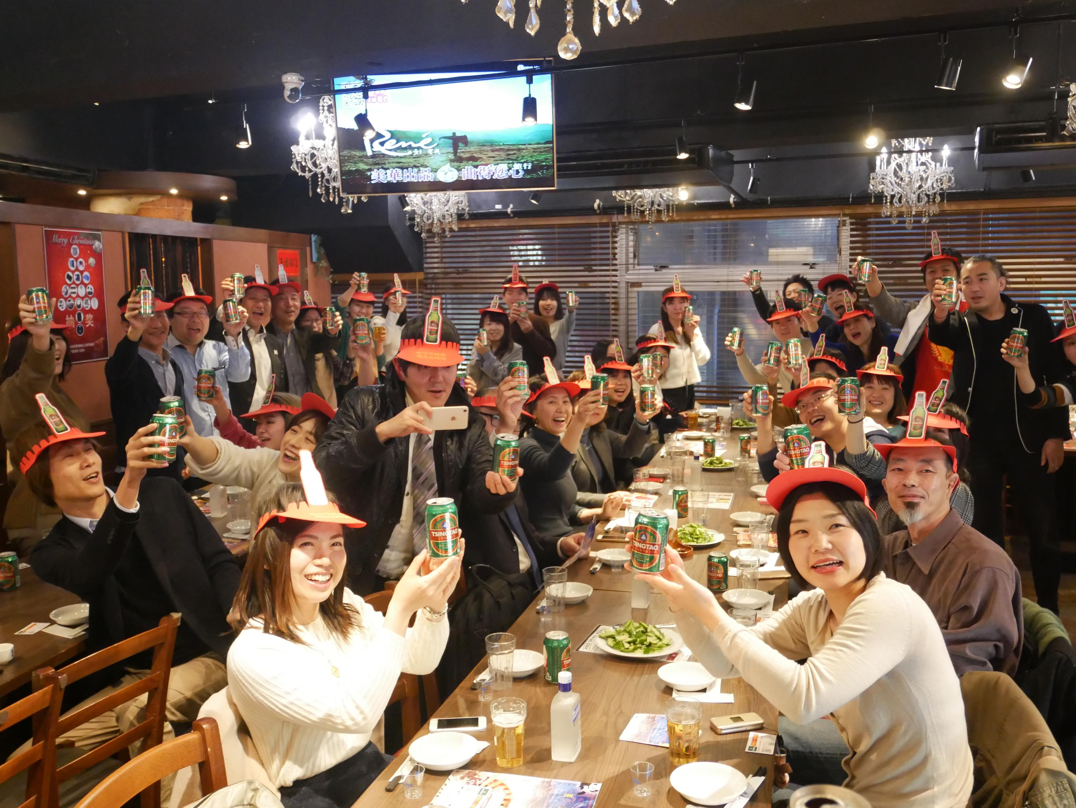 皆で青島ビールサンバイザーをつける謎の会に(笑)。とにかくおいしいもの食べて、乾杯して、盛り上がろう!というのがぼくらの宴会コンセプト。