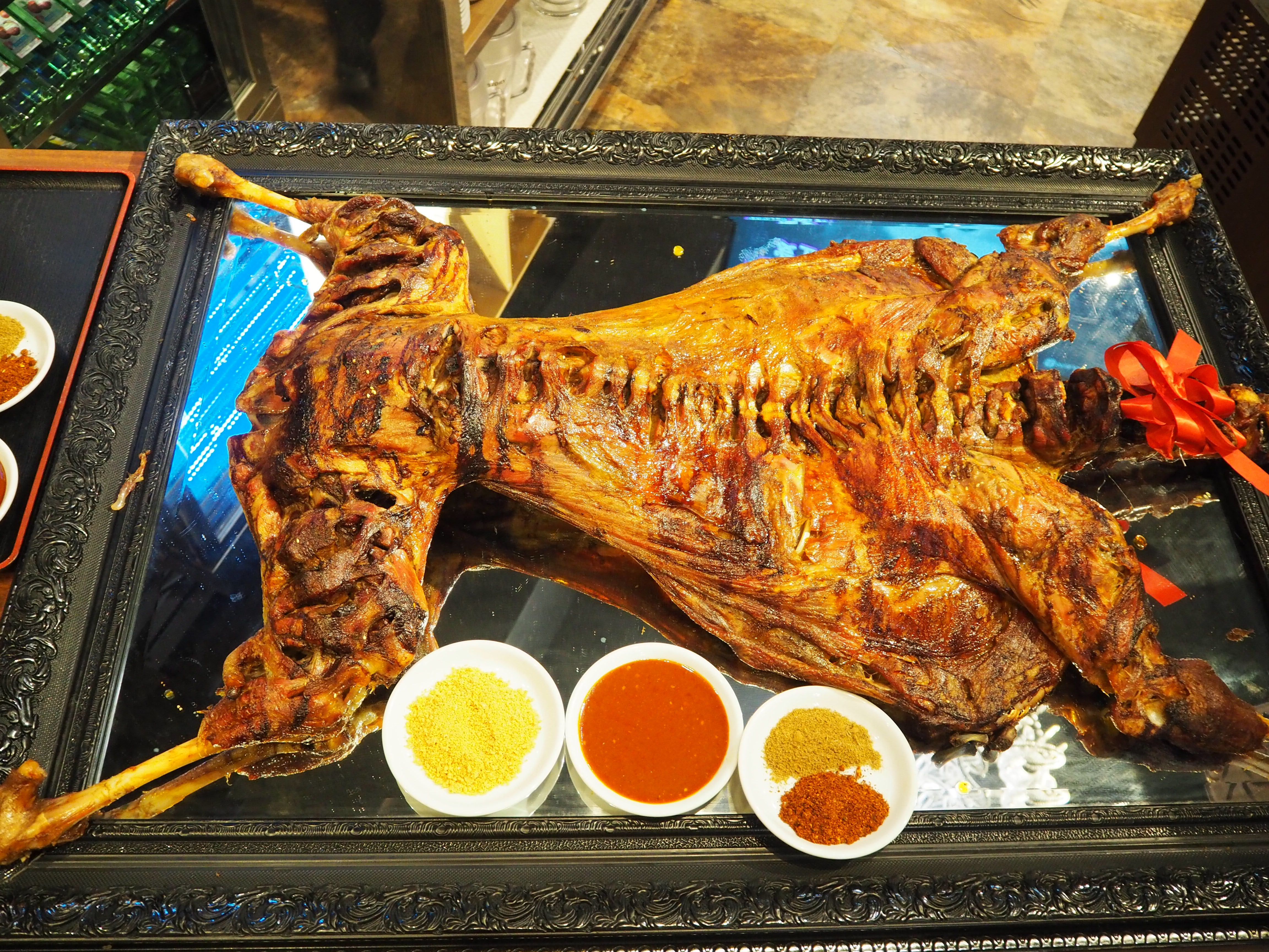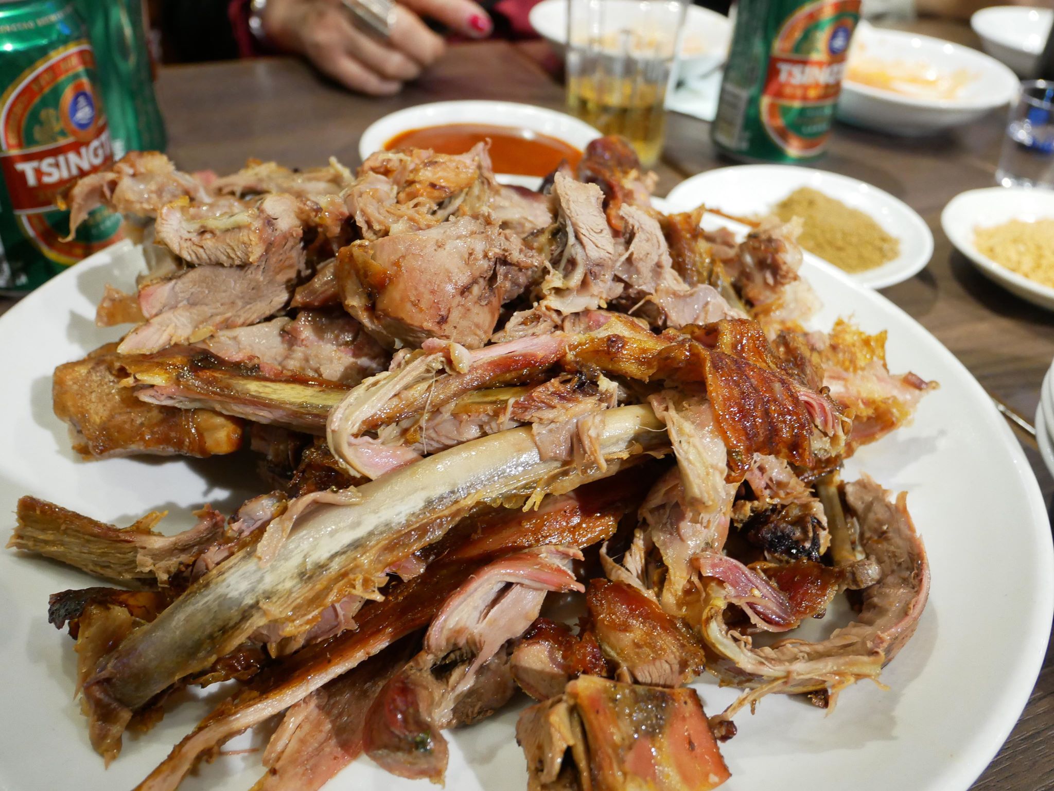 子羊なので、まぁまぁ小さいののかな?と勝手に想像していましたが、15㎏以上で想像を超える大きさ!手前の干碟(ガンディエ)はクミンと一味。その他、オリジナルのタレでいただきます。