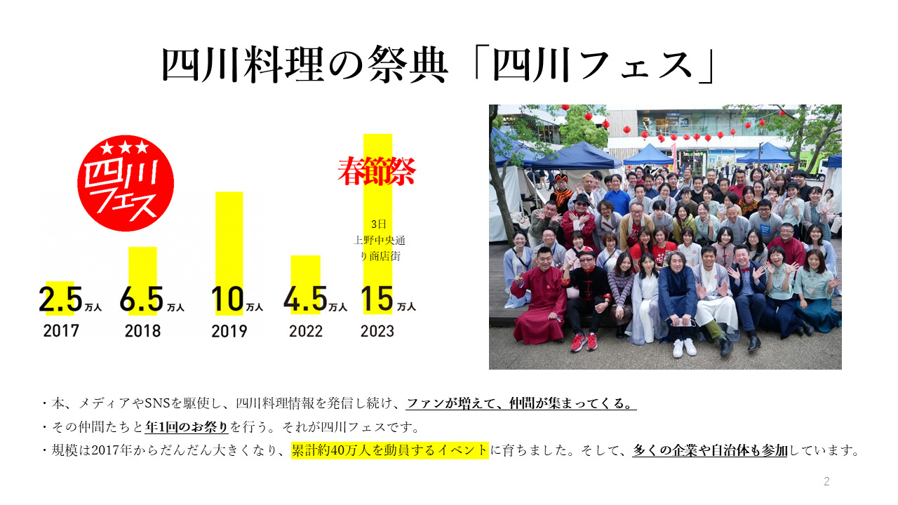 四川料理マニアたちがつくる四川料理の祭典「四川フェス」主催。過去動員数累計24.5万人。四川料理、しびれ、麻辣、マー活ブームに火をつけ中華業界を盛り上げる。