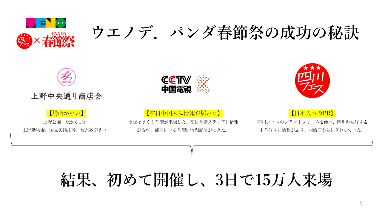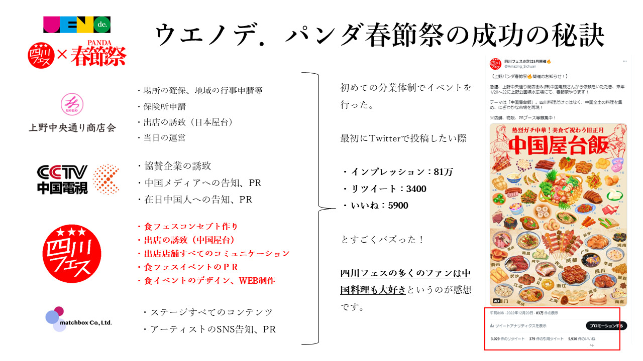 なので、四川フェスからの中国大型イベントというのは相性がいいのです。その証拠として、Twitterの四川フェス公式アカウントで「上野パンダ春節祭」のイベント告知を行った際、すごくバズりました。四川フェスより、反応がよかったです(笑)