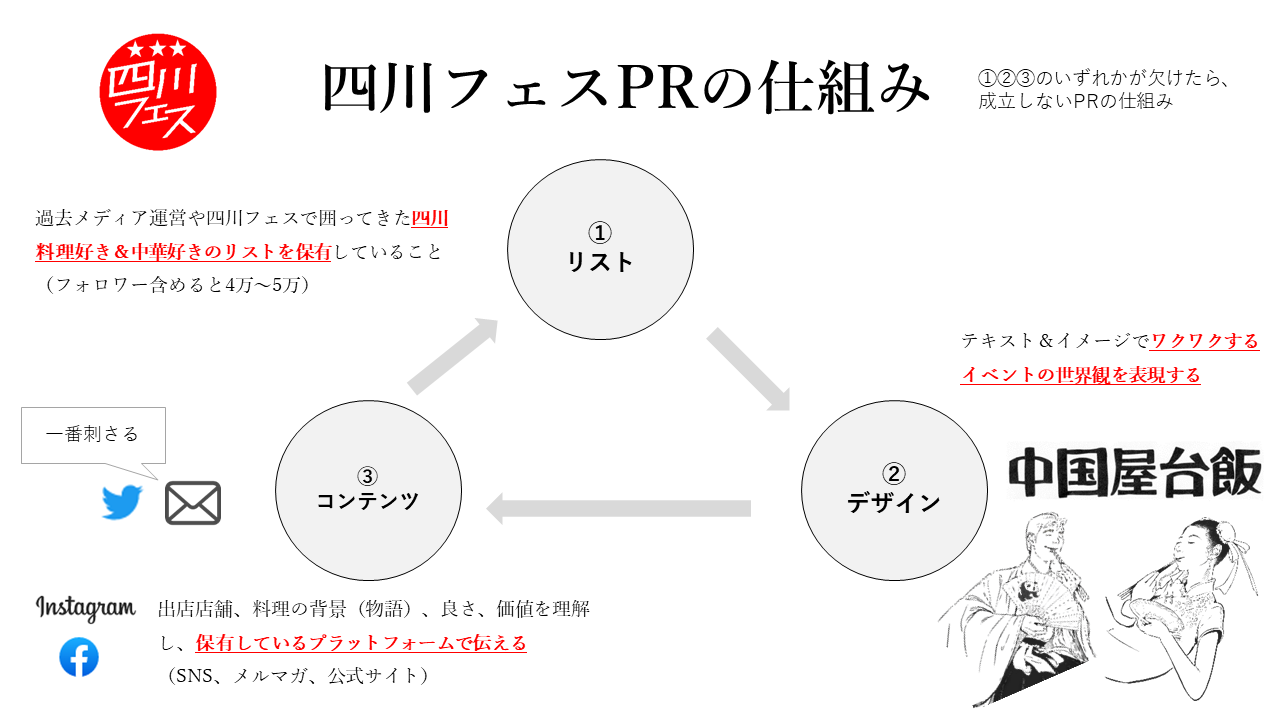 脱サラし、四川料理プロジェクトをはじめてもう10年以上。これまで蓄積し、育ててきたプラットフォームをフル活用し、PRします。具体的には以下の図のような感じです。