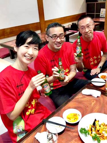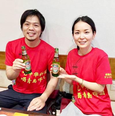 女性、男性みなで真っ赤な青島ビールTシャツに変身。テンション上がりますね!