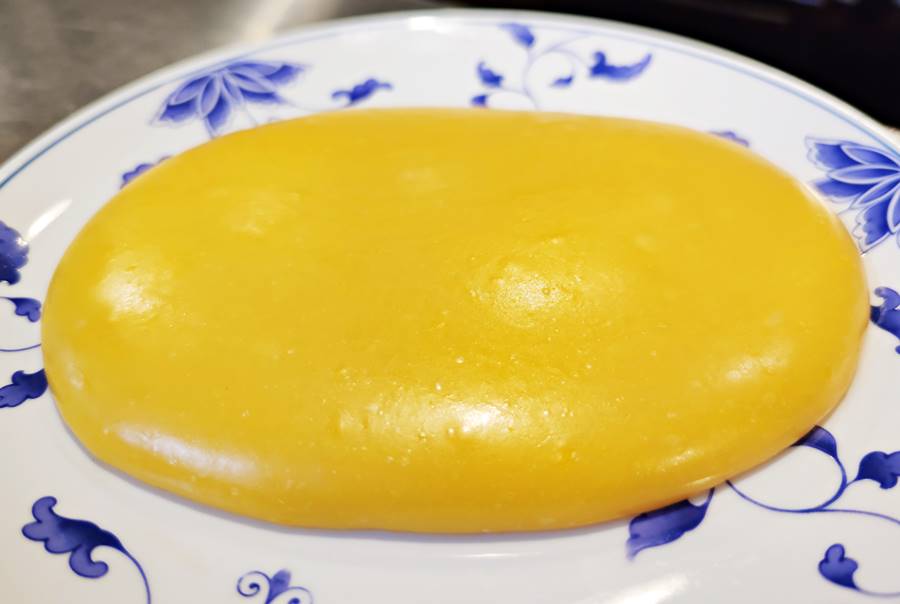 材料は卵、砂糖、片栗粉。そして、通常はラード(豚の油)を使うがこってりしすぎるので、千葉らしいピーナッツ油でつくっているとのこと。三不粘は作るのにかなり時間がかかるため、1日1つしか作らないと。なので、食べたい方は予め予約してくださいね。
