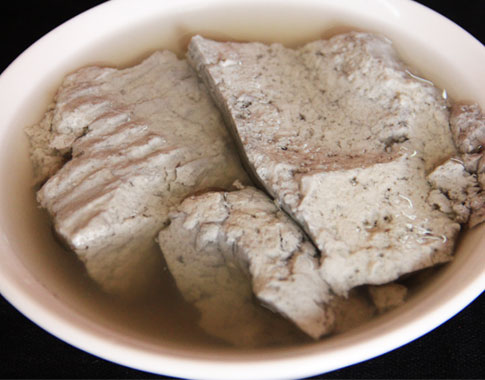 雪の中に埋まっている石を漢方入りの水薬に入れ、49日間漬ける。その漬けた石を砕き、鍋の中に大量の調味料を入れ魚と一緒に煮る鍋料理。