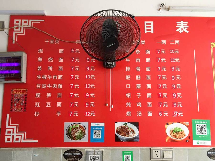 スープ麺の牛肉麺はこちらでは一两(小サイズ)が8元(130円)前後。これに対して燃麺は若干安く、5元から7元程度です。