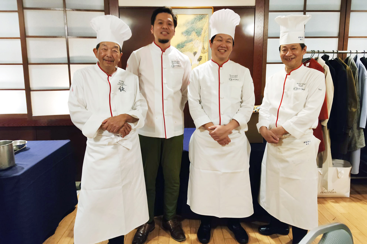 左から料理の鉄人でお馴染みの赤坂四川飯店二代目・陳建一氏、中川、三代目陳建太郎氏、鈴木総料理長。赤坂四川飯店さんで著書『涙を流して火を吹く四川料理の旅』出版記念パーティーを開催。その後、麻辣連盟結成、四川フェスなど、業界を盛り上げる企画を一緒にさせてもらっています。