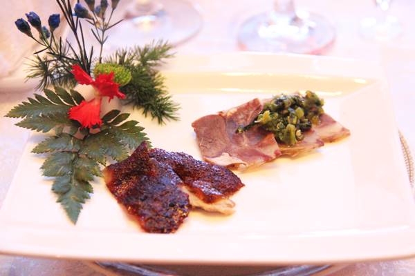 剁椒牛肉拼甜皮鸭(牛筋の冷菜、楽山名物のアヒル料理)