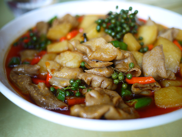 豚の内臓を煮込んだ料理。ハツ(心臓)など煮込み辛みのあるスープで味付け。