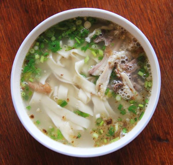 羊の内臓と平べったい面が入った透き通ったスープの麺。