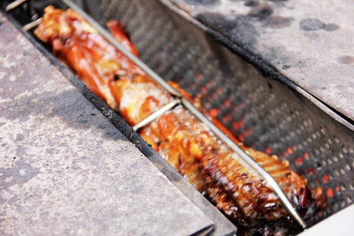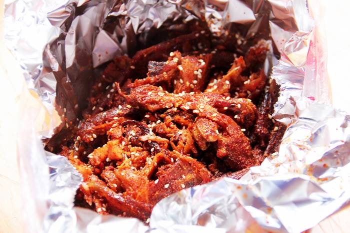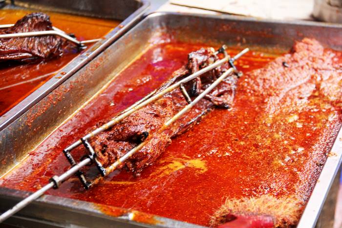 炭火でカリッと焼き、水分を飛ばし、辛いラー油とスパイスをたっぷりまぶしてたべる超スパイシーな料理です。早速一匹購入し、次のお店へ。