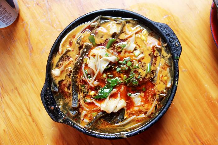ぐつぐつした砂鍋にとろとろに煮込まれた刀削麺。ラー油がパンチをだし、いい感じの具材たち。こんな料理が日常的に食べれる幸せ、まさに口福!!
