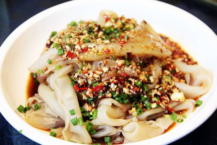 安岳県の名物の一つ「米巻(ミージュエン)」。米粉で作った広東料理の腸粉に煮た麺のようなもの。刻んだ唐辛子と薬味をいれ、ラー油と醤油、酢、にんにくで味つけをした郷土料理。