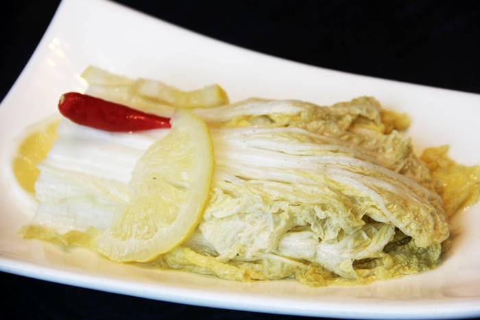 檸檬泡菜。檸檬を一緒にいれた白菜の漬物です。漬けてあるので、レモンの酸味は抜けていて、そのまま食べれます。白菜に移ったレモンの香り。この料理が一番レモンっぽい風味がありました。