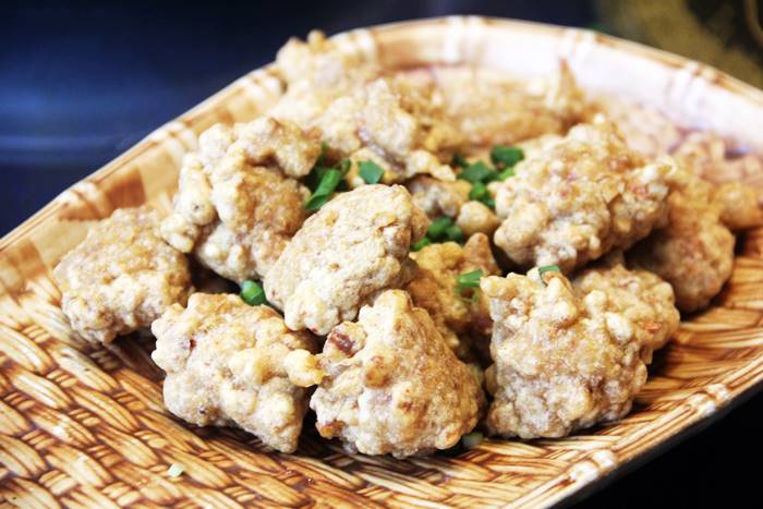まず衣の中に生のピーナッツがざっくりと入っています。さらに、肉は脂身。かりっと揚げた酥肉を一口かじってみると、生のピーナッツの柔らかい食感と素朴な衣の味がします。