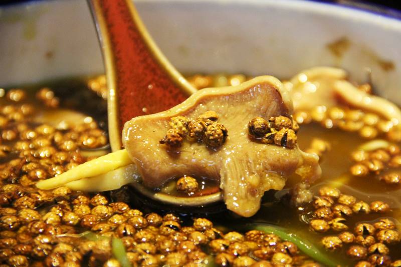 この花椒の海のような料理は麻辣牛舌。さわやかな青花椒がガツンとくる料理。この青花椒、質がよすぎて、一つ牛タンをたべるとしびれまくり。久しぶりに麻(マー)を強烈に味わいました。