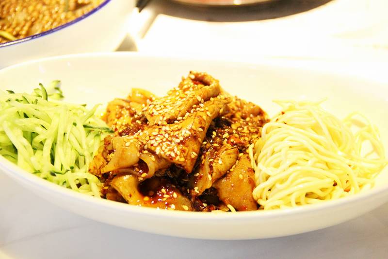 麺付きの蒜泥白肉。日本では豚肉の冷菜は雲白肉が有名ですが、四川では蒜泥白肉が定番です。