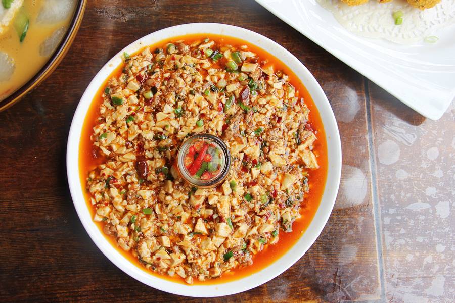 お皿が運ばれてきて、藁船をイメージしたお皿に納得しました。船底に沈んでいる豆腐にかかるのは大量の唐辛子。ちょっとびっくりしますが、本場で食べる唐辛子というのは痛みよりも香りが勝った辛みのように感じます。これだけ大量の唐辛子でありながら、濃厚な豆腐の風味が主役となった見事な一品でした。